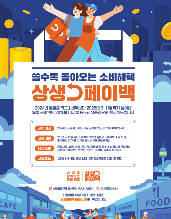 상생페이백은 2024년 월평균 카드 소비액 대비 2025년 9월부터 11월까지의 소비 증가액의 20%를 디지털 온누리상품권으로 환급해 주는 제도입니다.