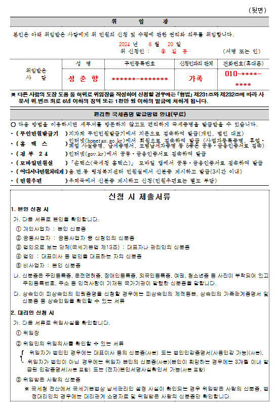 (1) 대리 발급 대상 및 필요 서류 국세 완납증명서는 원칙적으로 본인 발급이 권장되나, 본인 방문이 어렵거나 불가능한 경우 대리인을 통한 발급도 가능합니다.