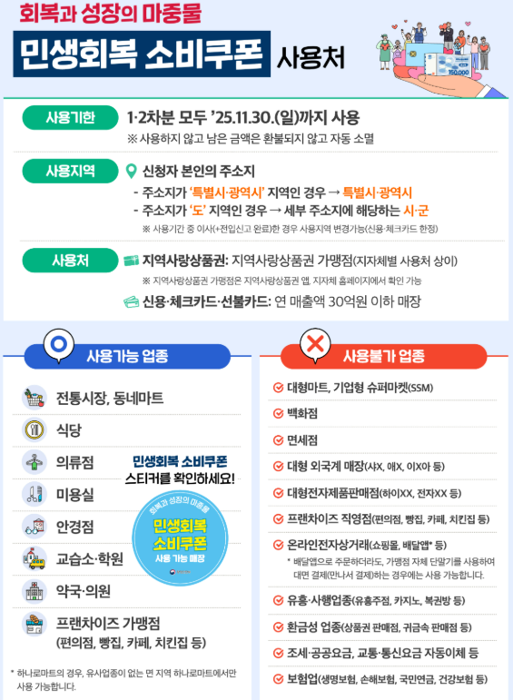 모든 민생지원금은 2025년 11월 30일까지 사용해야 하며, 이후에는 잔액이 자동 소멸됩니다. 따라서 되도록 빠른 시일 내에 사용하는 것이 바람직합니다.