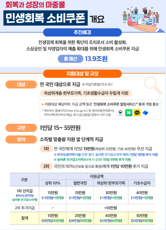 정부는 침체된 소비를 살리기 위해 전 국민을 대상으로 민생지원금을 단계적으로 지급합니다.