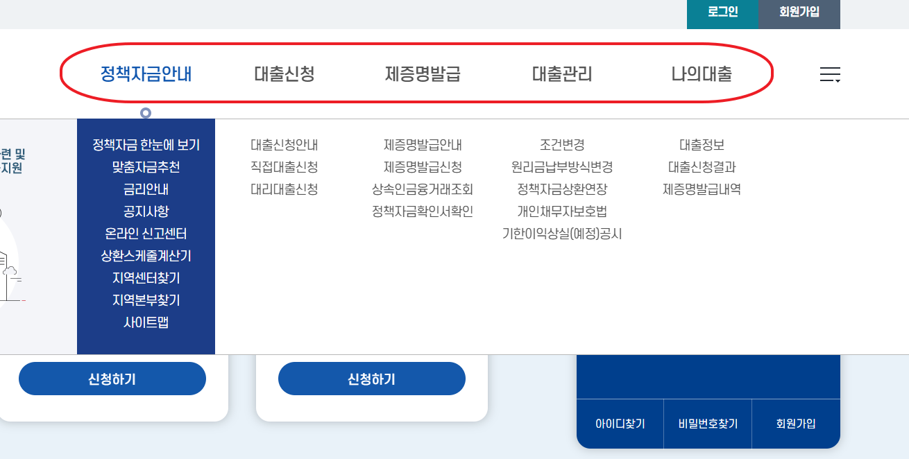 누리집 내에서 로그인 후 원하는 정책자금을 클릭하면, 신청 자격과 절차 안내 페이지로 이동합니다.