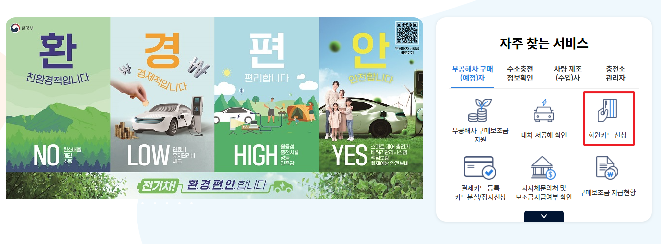 무공해차 통합누리집(ev.or.kr)에서 신청 가능합니다. 카드 종류, 혜택 등 상세 내용도 홈페이지에서 확인할 수 있습니다.