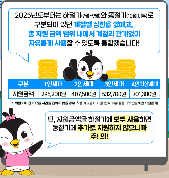 하절기는 7월 1일부터 9월 30일까지로 전기 요금에만 지원되며, 동절기는 10월 1일부터 다음 해 5월 25일까지로 전기, 도시가스, 지역난방, 등유, LPG, 연탄 등 다양한 에너지원에 사용 가능합니다.