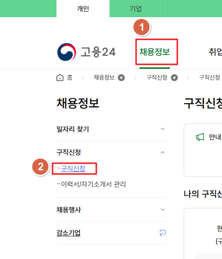 공식포털접속→개인인증→채용정보→구직신청 으로 먼저 구직신청을 합니다