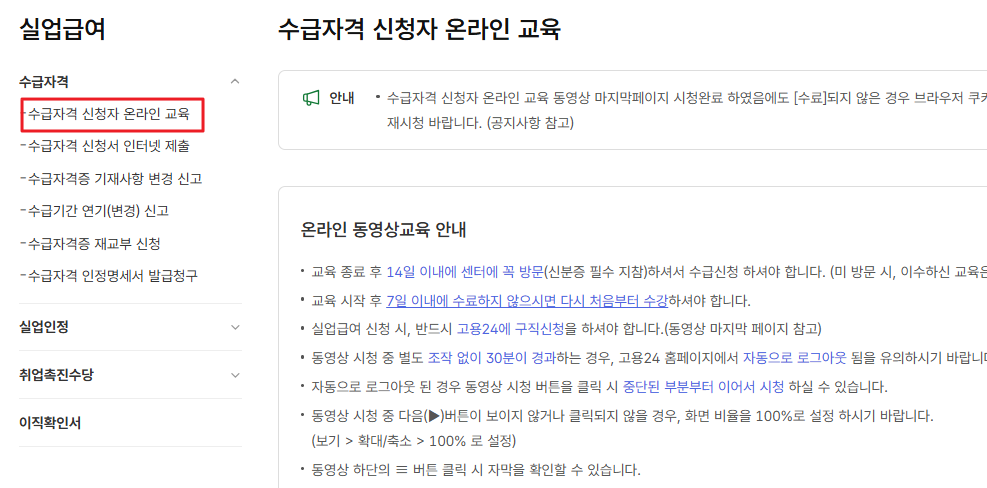 수급자격 온라인 교육을 미리 수강해 놓습니다 (교육 수강후 14일 내에 센터에 방문해야 함)