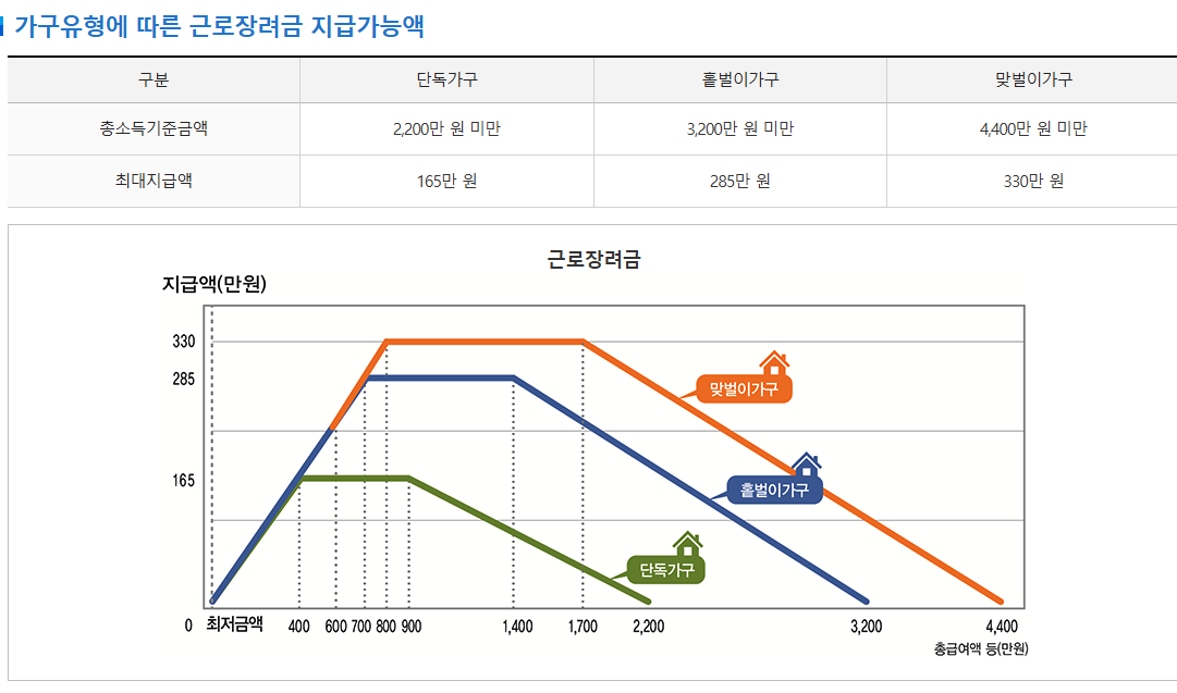 예를 들어, 2025년도 기준 단독가구의 경우 총소득 기준 상한선 내에서 최대 장려금액이 정해질 수 있습니다.