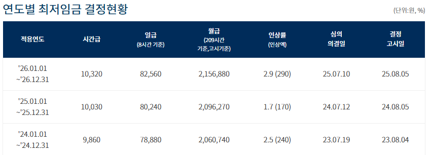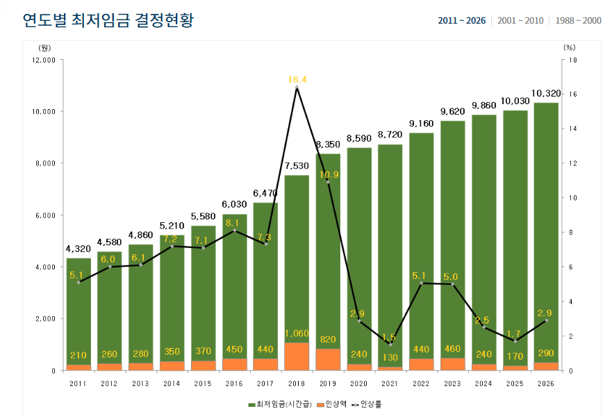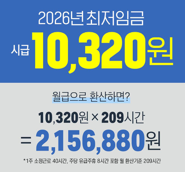 (1) 2026년 최저임금은 시급 10,320원으로 최종 결정되었습니다. 이는 전년 대비 290원 인상된 금액으로, 인상률은 2.8%입니다.