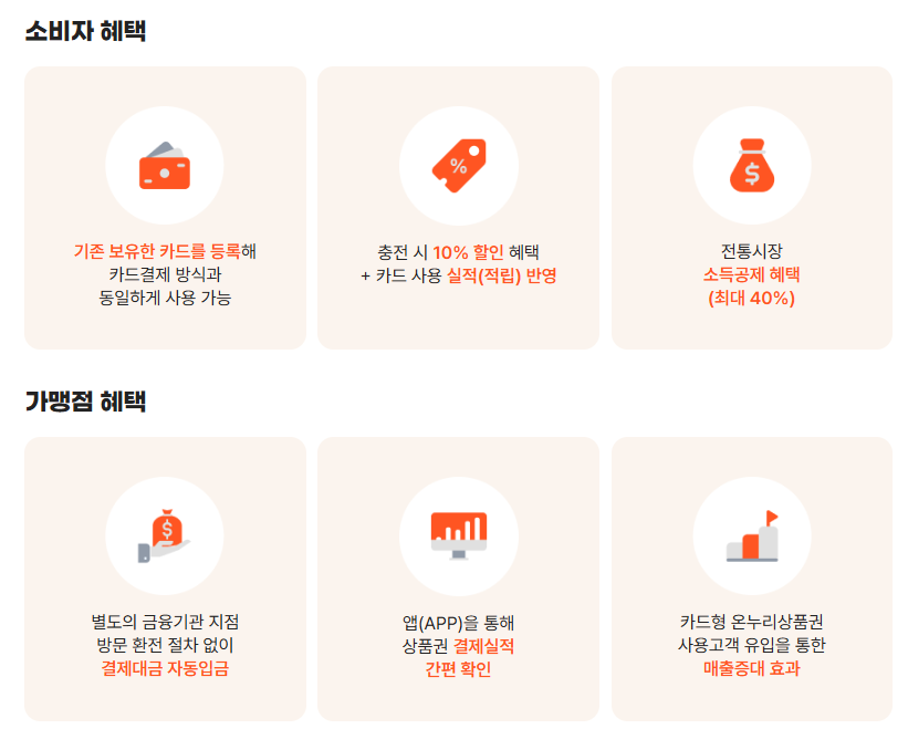 지갑 없이 스마트폰 하나만으로 전통시장 및 상점가에서 결제가 가능해 젊은 세대와 비대면 결제에 익숙한 분들에게 특히 인기가 많습니다. 온라인 전통시장관 등 온라인 사용처에서도 간편하게 이용할 수 있는 장점이 있습니다.