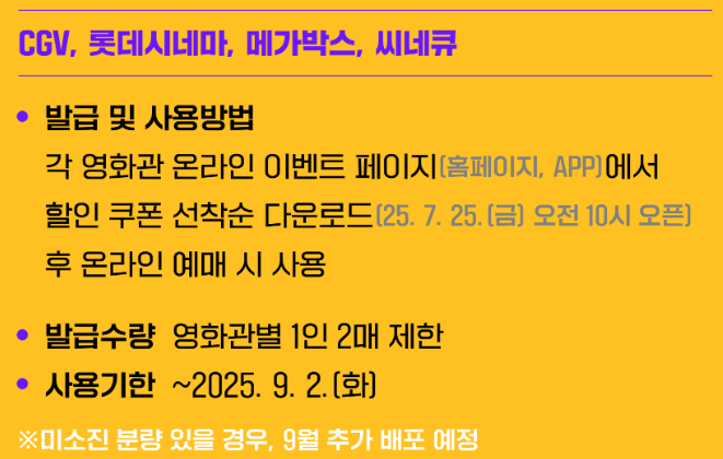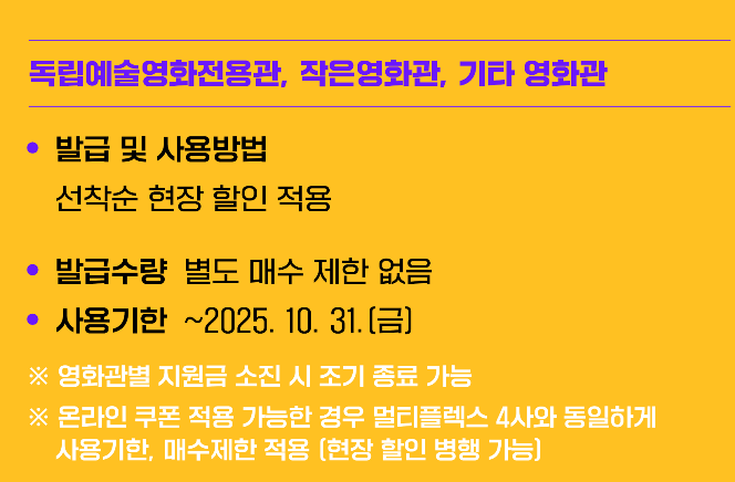 만약 특정 영화관이 시스템상 온라인으로 할인권을 제공하기 어려운 경우에는 해당 영화관에서 현장 선착순으로 할인을 제공할 예정입니다.