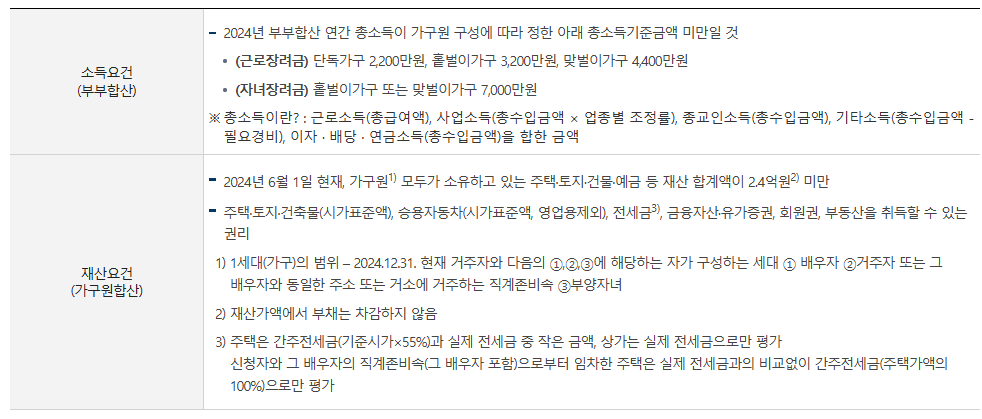 (2) 재산 요건: 가구원 전체가 소유하고 있는 재산 합계액이 기준 금액 미만이어야 합니다. 현재 기준으로는 전년도 6월 1일 현재 가구원 소유의 주택, 토지, 건물, 예금, 자동차 등 재산 합계액이 2억 4천만원 미만이어야 합니다.
