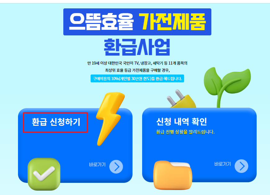 만 19세 이상 대한민국 국민이 TV, 냉장고, 세탁기 등 11개 품목의 최상위 효율 등급 가전제품을 구매할 경우, 구매비용의 10%(개인별 30만원 한도)를 환급해 드립니다.