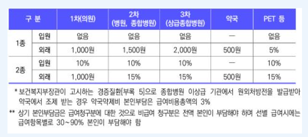| 의료급여 2종 | 총 진료비의 10~15% | 총 진료비의 10% |