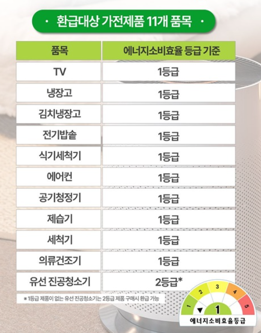 (1) 고효율 가전제품 환급 대상 품목은 한국에너지공단에서 정한 특정 품목에 한정됩니다. 이 품목들은 에너지 효율 등급이 '으뜸효율'로 인정된 제품들이며, 대개 1등급이나 그에 준하는 높은 효율을 자랑합니다.