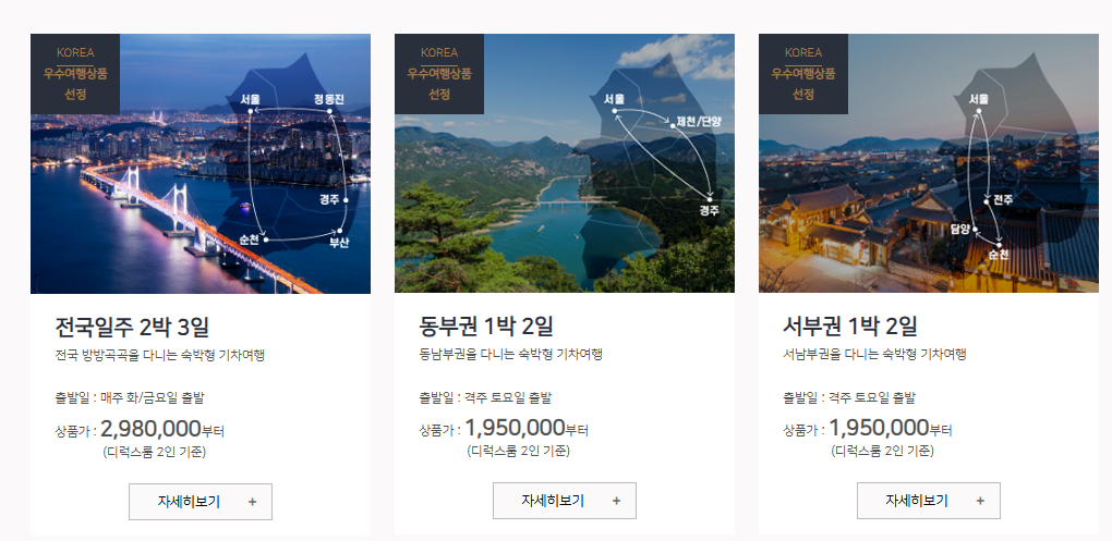 (2) 각 코스마다 특색 있는 테마와 방문 도시가 달라 여행객들의 다양한 요구를 충족시켜 줍니다. 예를 들어 동부권은 설악산, 경주 등 자연 경관과 역사 유적 중심이며, 서부권은 여수, 목포 등 남도 문화와 맛을 즐길 수 있는 여정입니다.