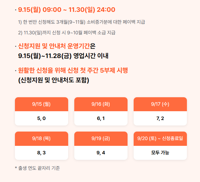 A2. 아니요, 신청 첫 주에 시행되는 5부제는 원활한 신청을 위한 조치일 뿐, 9월 20일(토)부터는 출생연도 끝자리와 관계없이 누구나 11월 30일(일)까지 신청할 수 있습니다. 11월 30일까지 신청하시면 9월과 10월 소비에 대한 페이백도 소급 적용됩니다.