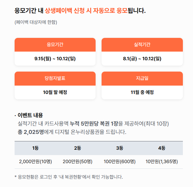 8월 1일부터 10월 12일까지의 누적 결제액 5만원당 1회씩, 최대 10회까지 응모가 가능합니다. 소비가 늘수록 복권 응모 기회도 늘어나는 방식입니다.