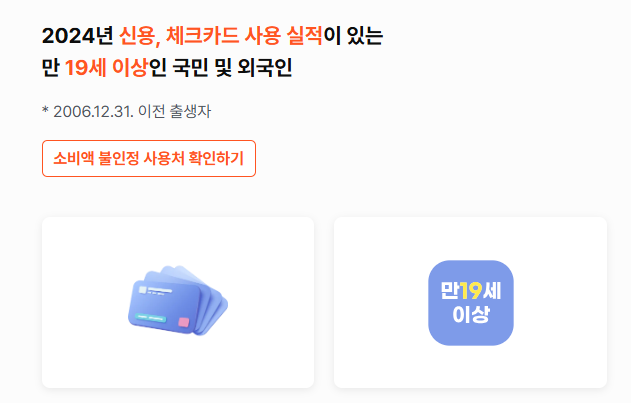 (1) 상생페이백은 2024년에 신용카드나 체크카드를 사용한 실적이 있는 만 19세 이상 모든 국민과 외국인에게 열려있는 제도입니다.