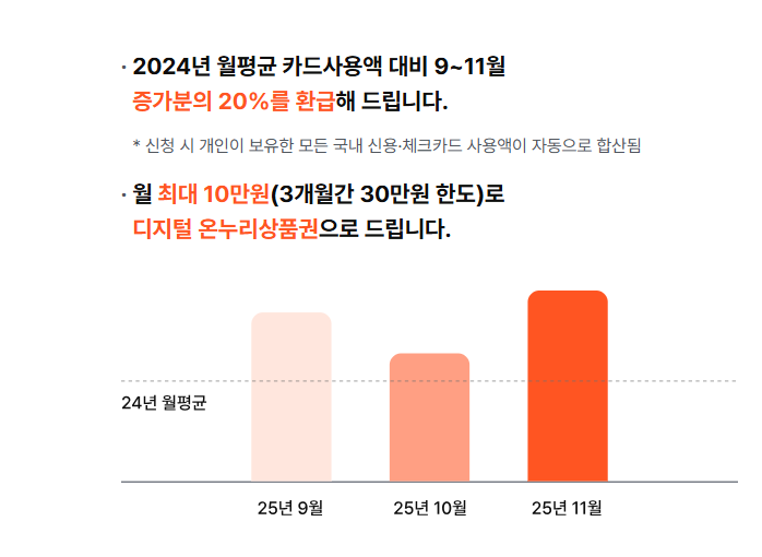 (1) 지급 금액은 2024년 월평균 카드 사용액과 비교하여 2025년 9월부터 11월까지 증가한 월별 소비액의 20%입니다.