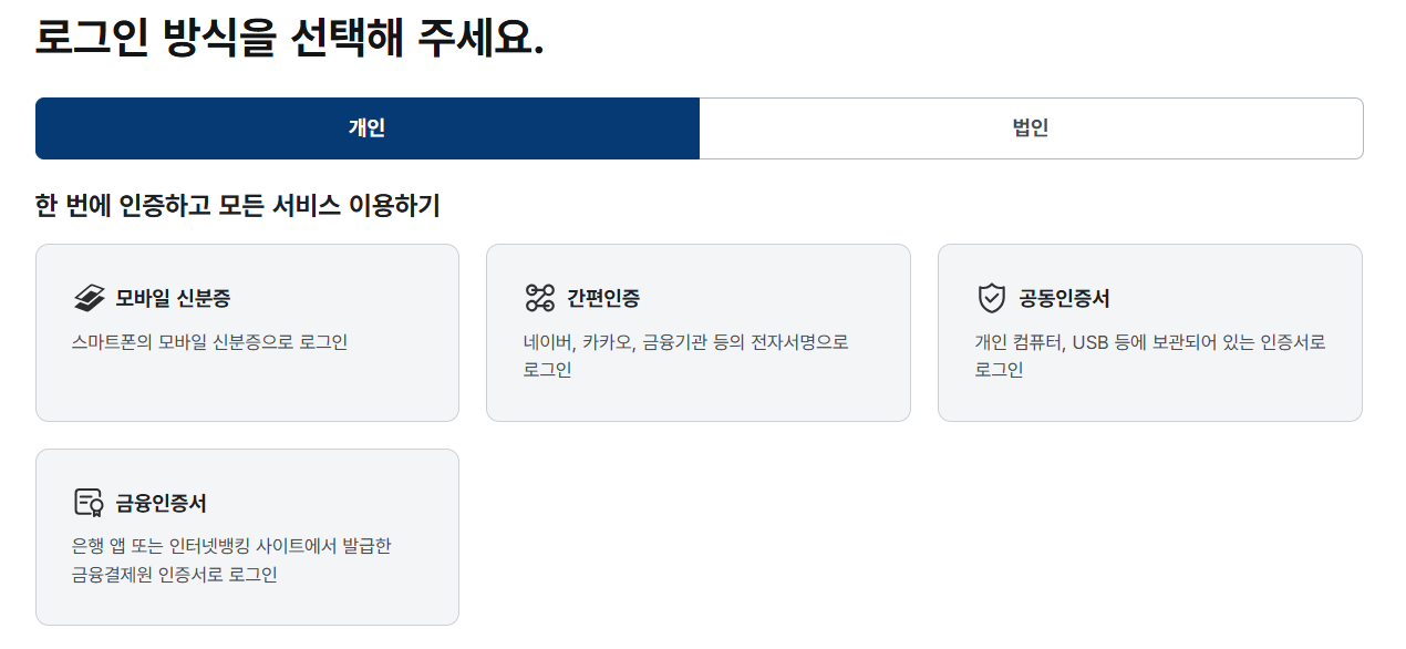 | 필요 서류 | 공동인증서(간편 인증서 포함) | 신분증 |